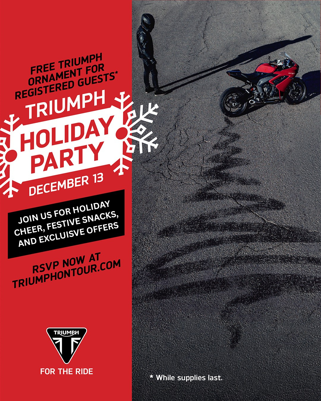 Get ready to celebrate the season, Triumph style! Join us for the Triumph Houston Holiday Party on Saturday, December 13th from 12–3 PM right here at the dealership. Secure your spot by registering at triumphontour.com. As a thank-you for signing up, you’ll receive your own exclusive Triumph holiday ornament—a perfect collectible for any fan! Bring your riding... [Read More]